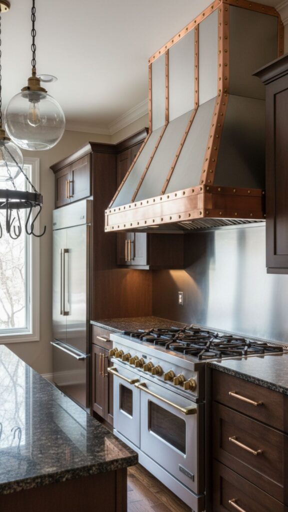 Why settle for one metal when you can have two? Mixed metal hoods—often combining stainless steel with brass, copper, or matte black straps—create a sophisticated, custom look. This approach allows you to tie together different hardware finishes in your kitchen, such as a stainless faucet and brass cabinet pulls.