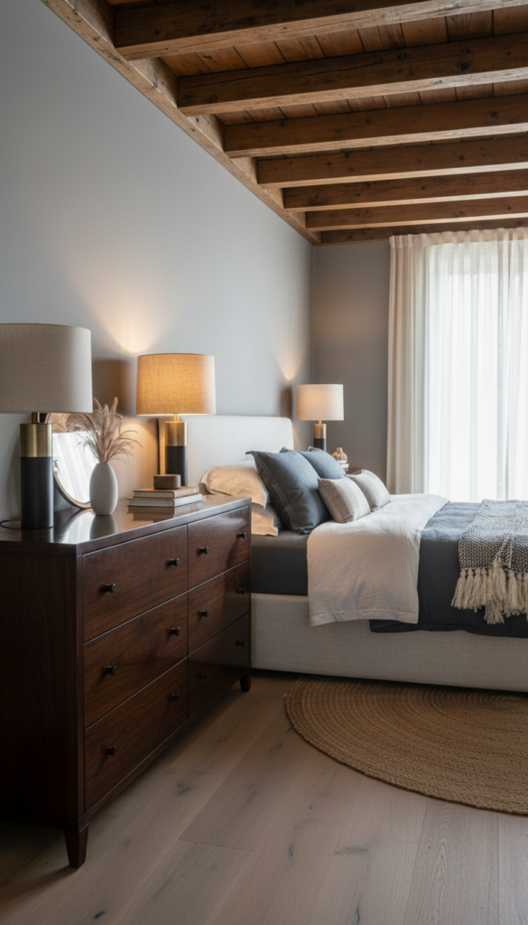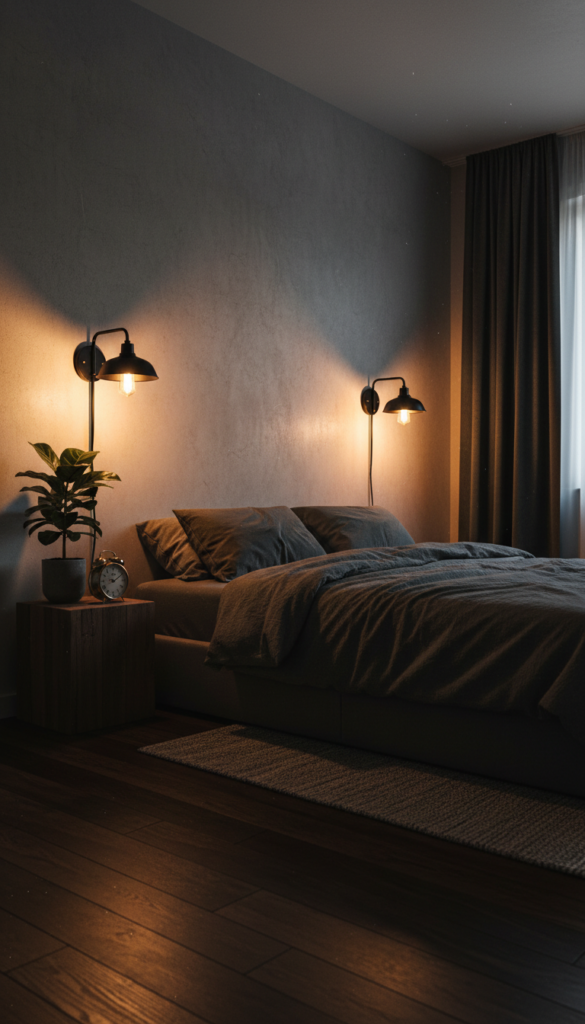 - Fixtures: Install black or aged bronze wall sconces on either side of the bed to free up nightstand space.