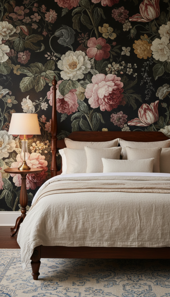 Wallpaper has made a massive comeback, and it fits perfectly within this aesthetic. Look for “Dutch Master” style prints—large-scale florals on a black or dark background. It feels romantic and nostalgic without being overly sweet.