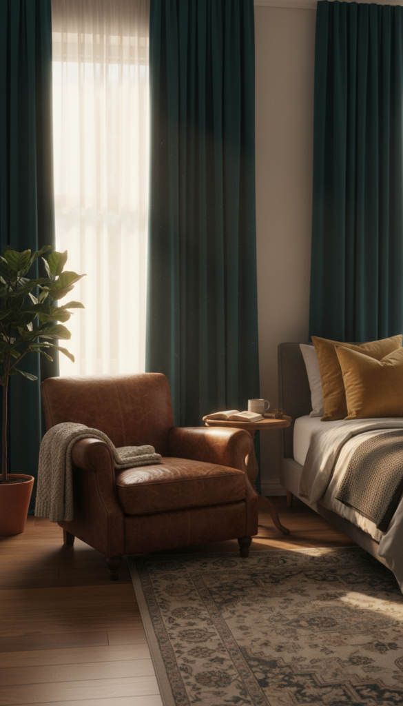 - Seating: Place a worn leather armchair or a leather bench in the corner or at the foot of the bed.