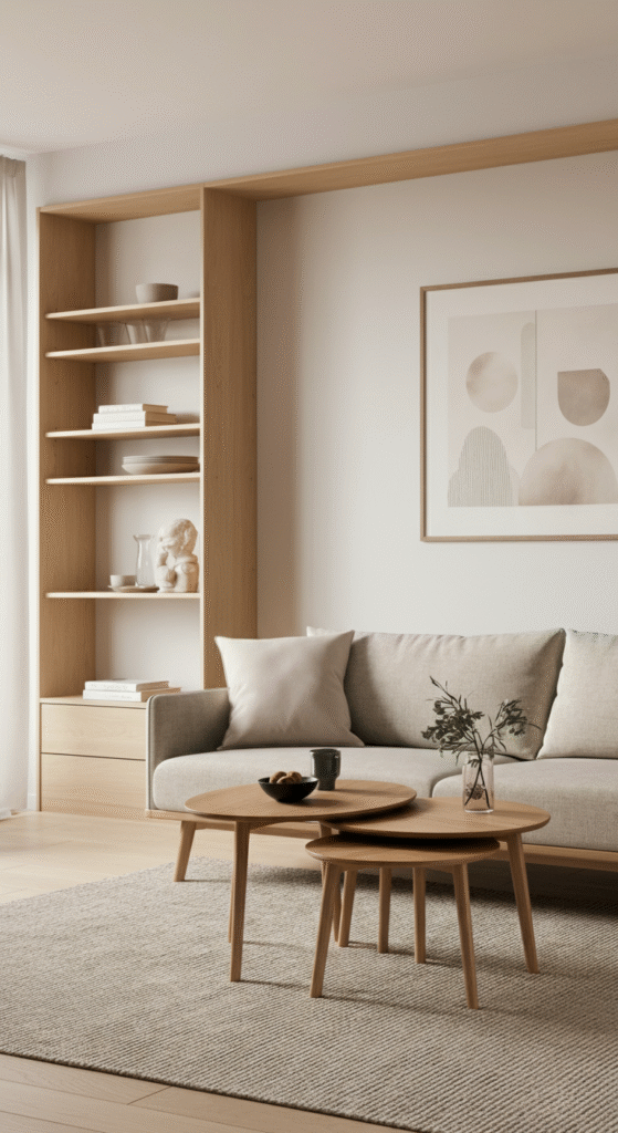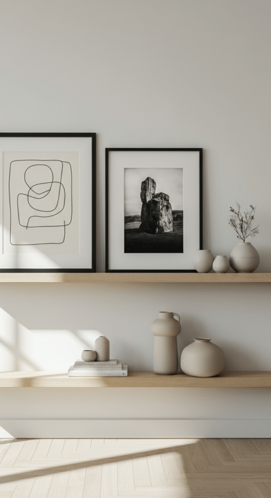 Floating shelves with neutral-toned ceramics or small sculptures also enhance character without overwhelming space. Less art, more impact—that’s the Nordic way.