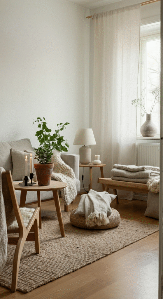 The secret is comfort through simplicity. Hygge doesn’t mean filling your space—it means making every detail intentional.