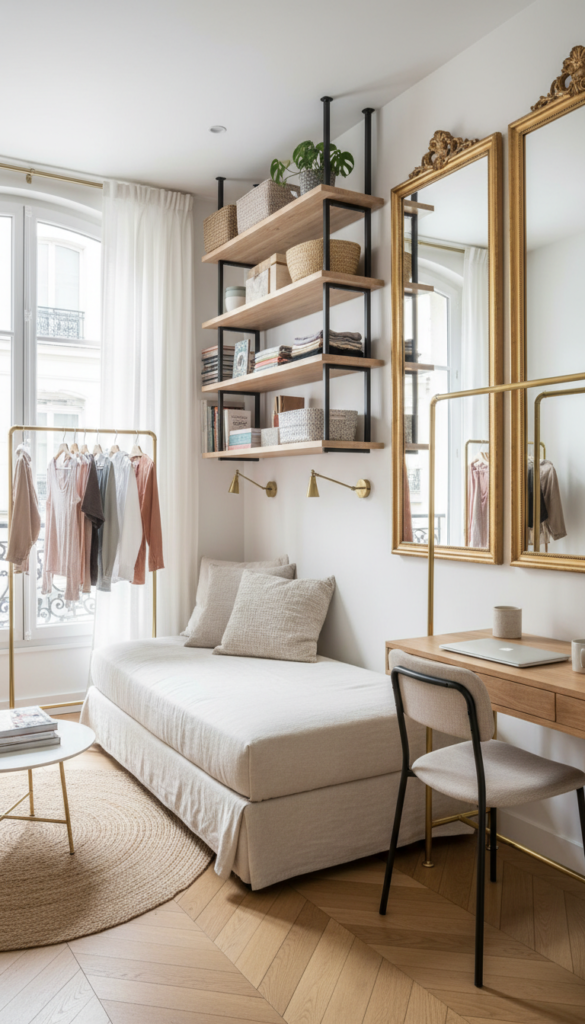 Paris is known for its tiny “chambres de bonne” (maid’s rooms) turned into chic studios. This aesthetic is all about functionality meeting style. It utilizes multifunctional furniture, mirrors to expand the space, and vertical storage. The look is compact, clever, and undeniably stylish.