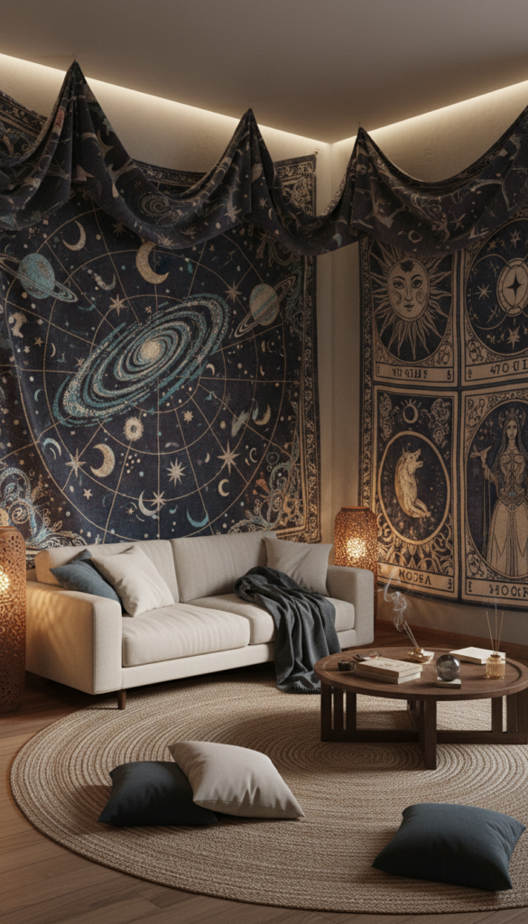 Textiles add softness to the rough edges of grunge design. A large tapestry hanging over the bed or covering a blank wall introduces pattern and mysticism. Look for celestial themes, tarot card designs, or darker tie-dye patterns.