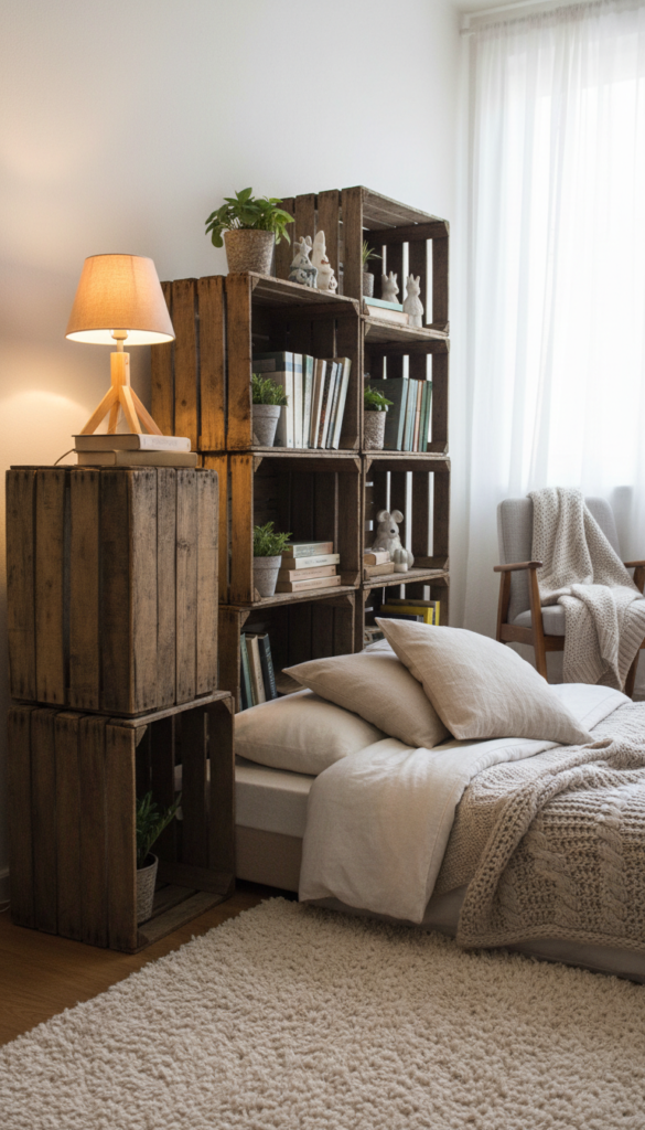 - Stack two crates next to the bed as a nightstand.
