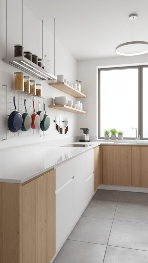 When you can’t build out, build up. Wall-mounted racks for pots, pans, and utensils free up precious cabinet space and keep essential tools within arm’s reach.