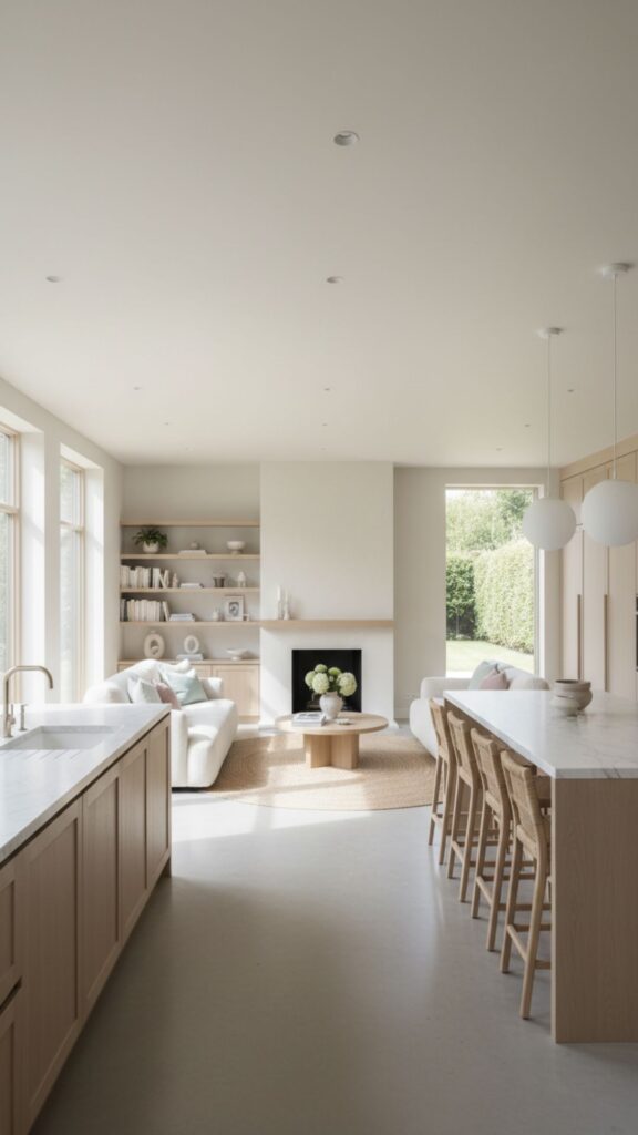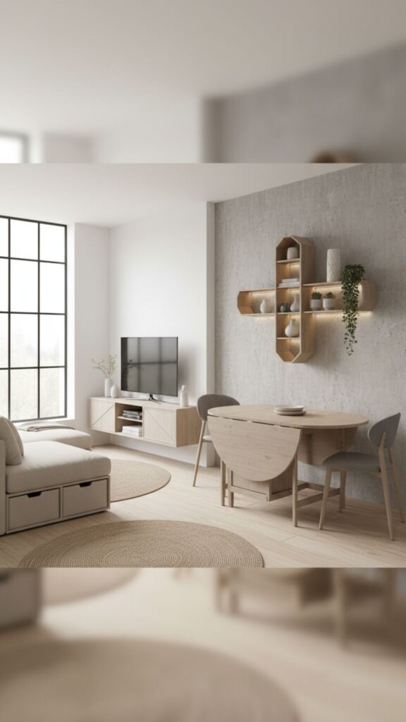 Using glass or acrylic furniture (like “ghost chairs”) allows light to pass through, reducing visual obstruction and making the room feel larger.
