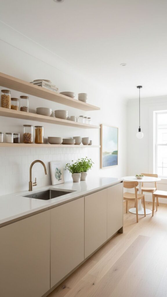 Heavy upper cabinets can make a narrow kitchen feel boxy. Removing doors or installing floating shelves opens up the room, creating a sense of airiness while forcing you to keep clutter to a minimum.