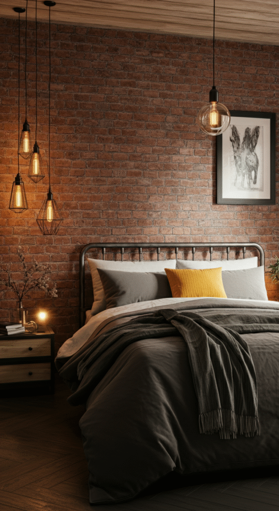 Exposed brick walls, steel frames, and minimalistic furniture contrast beautifully with natural wood accents, warm lighting, and plush textiles. Industrial lighting, like black pendant lamps, and neutral tones make the space feel grounded yet inviting.