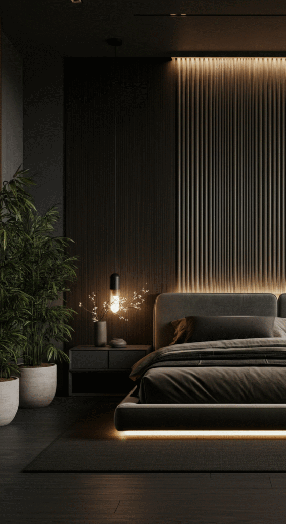 Focus on natural materials such as bamboo, stone, and wood, complemented by neutral tones like soft greys, whites, and earthy shades. Furniture is minimal and functional, while elements like indoor plants, soft lighting, and clean lines create an environment conducive to relaxation.