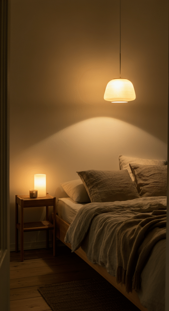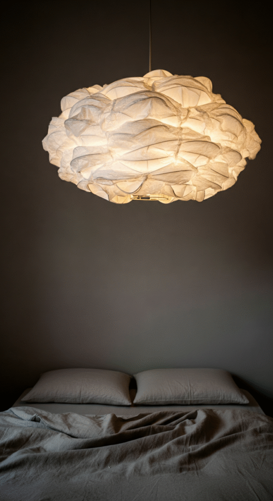 This kind of light creates a haze-like glow that’s super relaxing right before sleep. If your bedroom feels too harsh or bright at night, this is the fix. Soft pendant lights also remove shadows, making the room feel cleaner and more balanced.