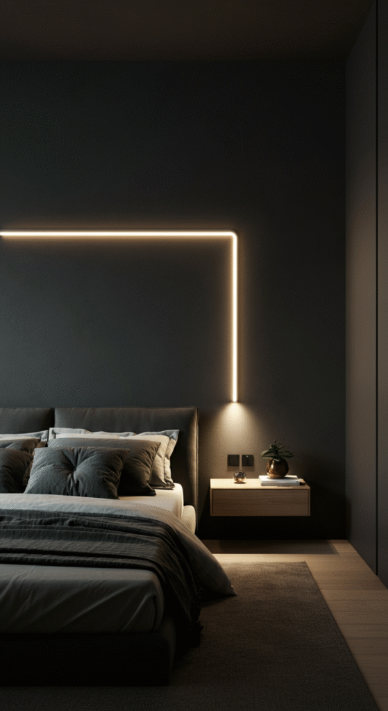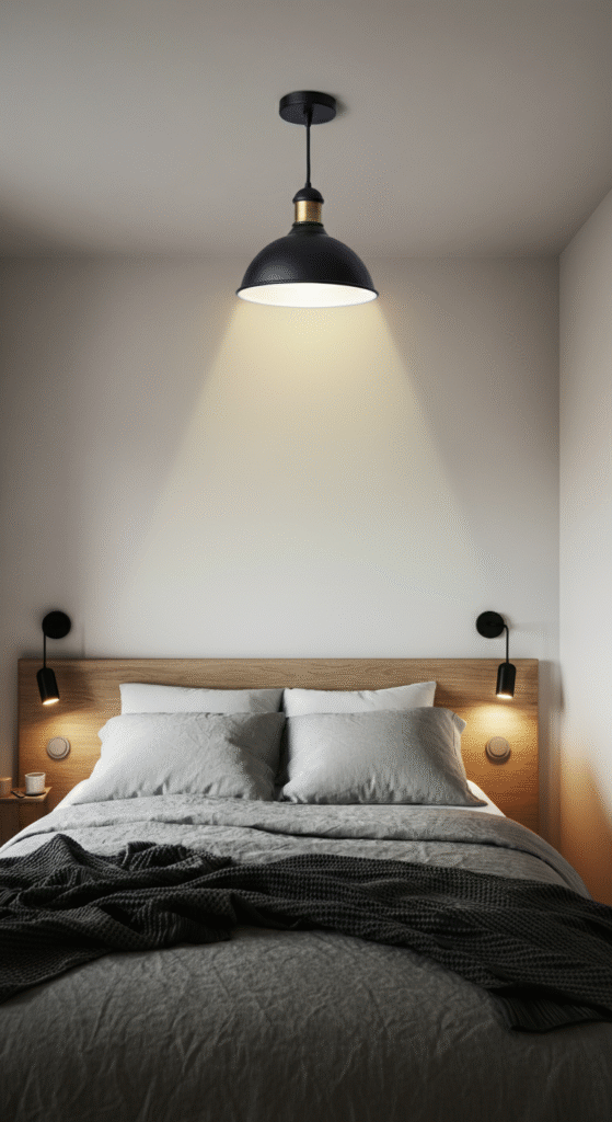 Scandinavian design usually leans toward soft tones, but matte black lighting has become a modern trend. It adds contrast in a very controlled, elegant way. When used above the bed, matte black fixtures anchor the room without feeling heavy.