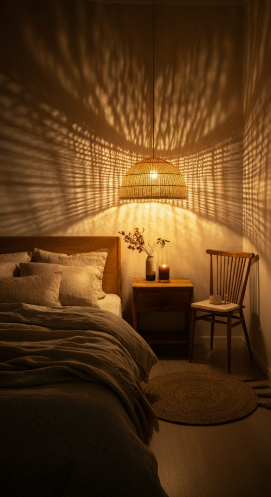 Interesting fact: Rattan allows tiny pockets of light to escape through its weave, creating the softest cozy pattern on your walls. That pattern naturally makes the room feel comforting.