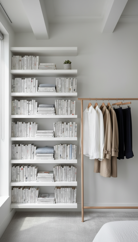 Floor space is the most expensive real estate in New York. The Scandi-NYC approach solves this by building up rather than out. Floating shelves and tall, slender wardrobes draw the eye upward, making ceilings appear higher while keeping clutter off the floor.