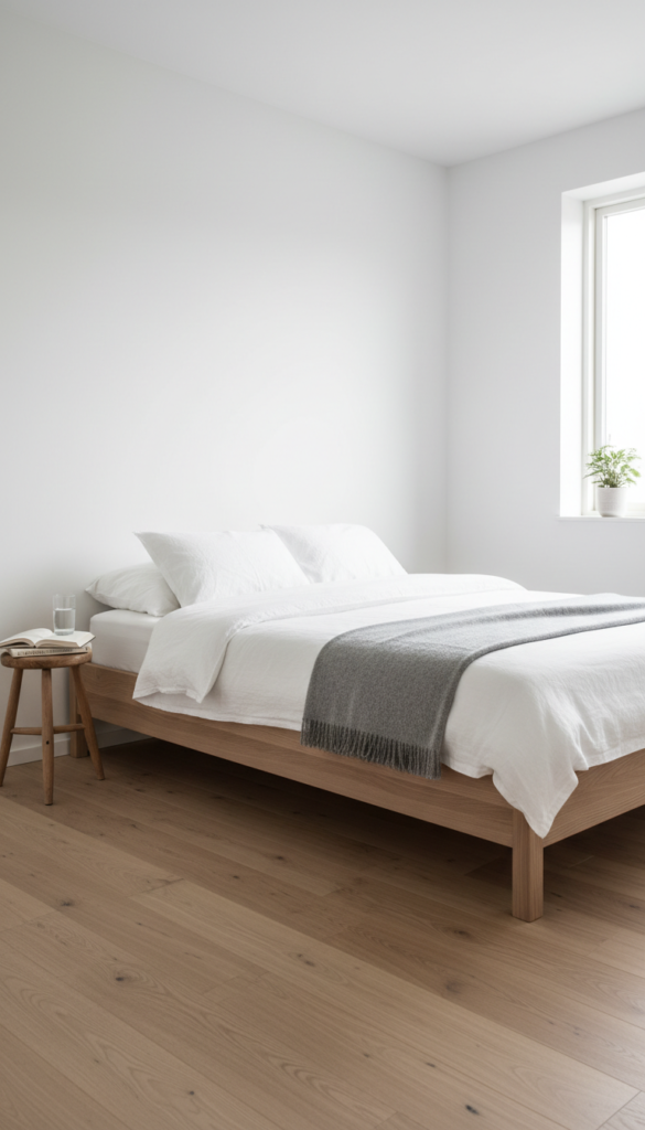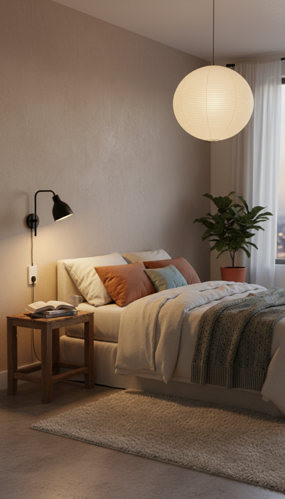 While not strictly necessary, a rug anchors the bed and adds essential “hygge” texture. In a rental with old floors, a large area rug can also brighten the space significantly.