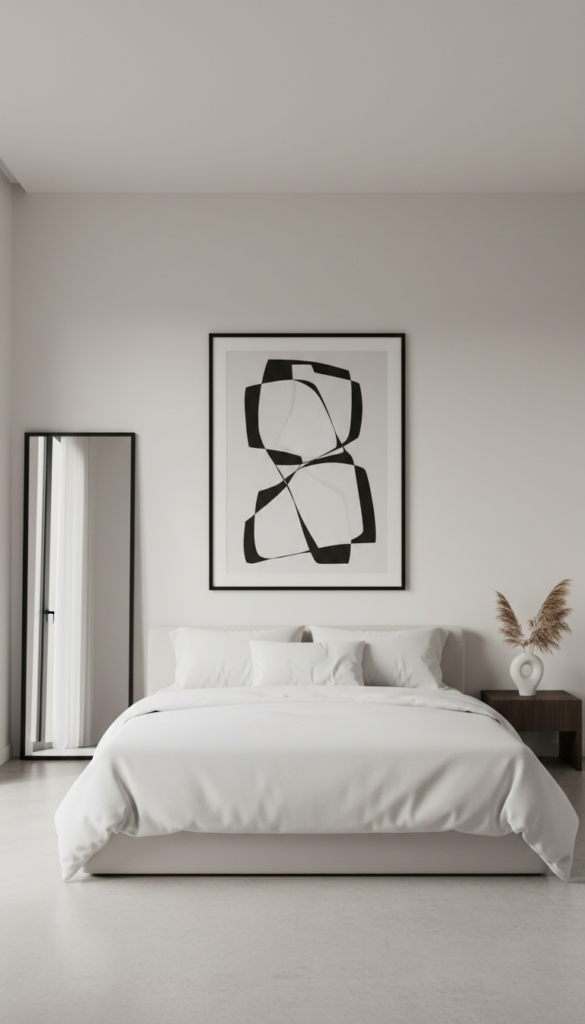 Instead of a busy gallery wall that can make a small room feel closed in, opt for one or two large pieces of art. This creates a focal point without visual noise. Black and white photography or abstract line art fits the aesthetic perfectly.
