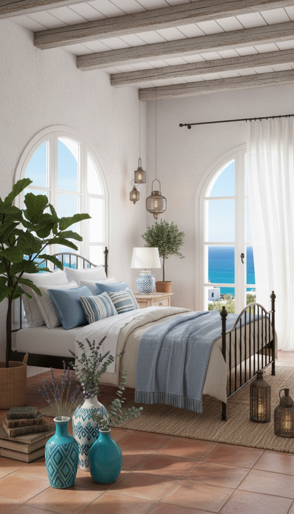 To recreate a Mediterranean bedroom, use warm, earthy colors like terracotta, deep blue, and olive green. Incorporate natural textures such as jute rugs, wrought-iron furniture, and wooden shutters. To add a bit of drama, hang a statement chandelier or ornate mirror to reflect light and make your space feel larger and airier.