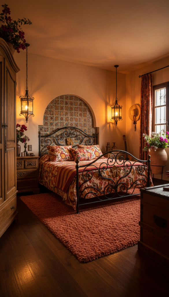 For a Spanish-style bedroom, opt for terracotta tile flooring, wrought-iron bed frames, and hand-painted tiles or murals. Rich colors like burnt orange, deep red, and golden yellow will fill your space with warmth. Add vintage-inspired accessories, such as antique mirrors and rustic wood furniture, for a touch of history and authenticity.