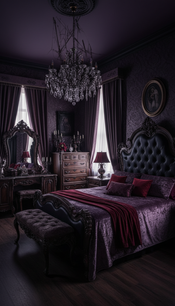 To create a gothic-inspired bedroom, use deep, rich colors like purple, burgundy, and black. Choose ornate furniture pieces with intricate carvings and bold patterns. Velvet curtains, dark wood furniture, and chandeliers can elevate the drama of the room, while soft lighting helps soften the mood for a more romantic atmosphere.