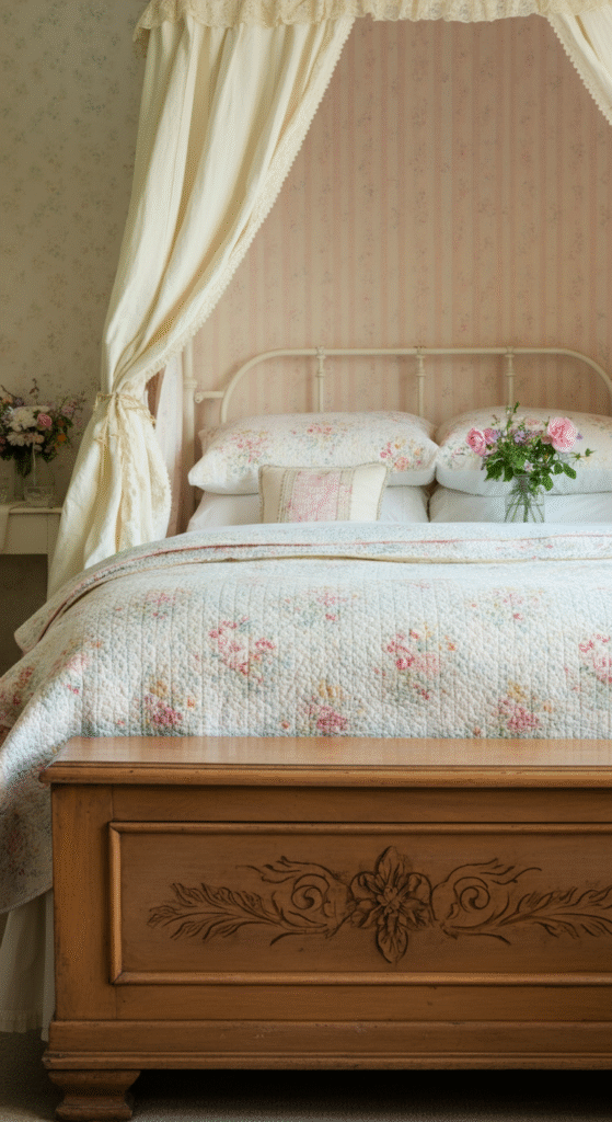 Soft lighting, natural wood, floral curtains, black iron headboards, or traditional dressers.