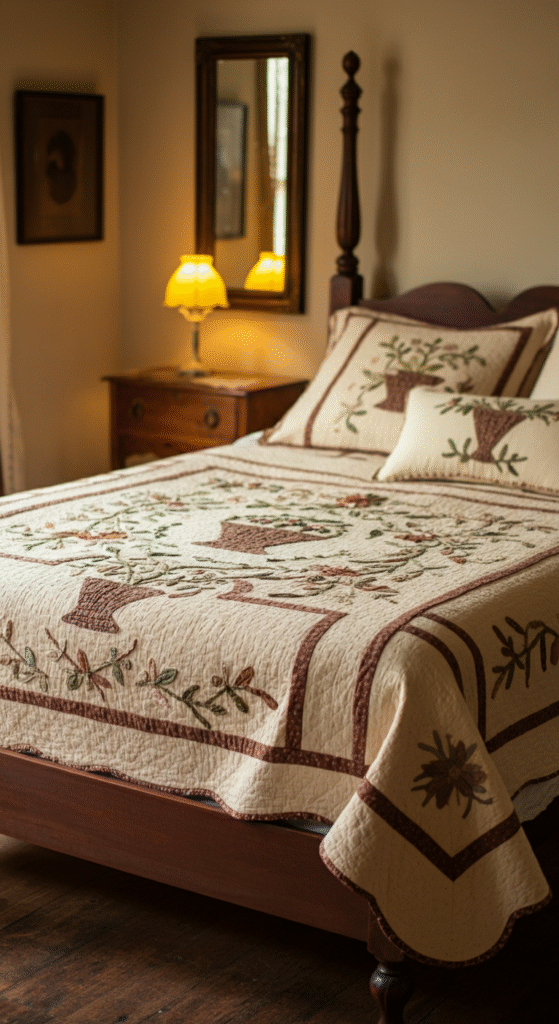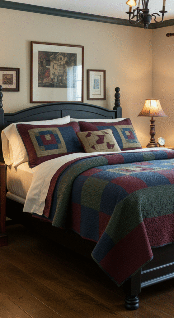 These quilts are perfect if you want a traditional look but without floral patterns or too much detail. They give a strong heritage vibe while staying neat.