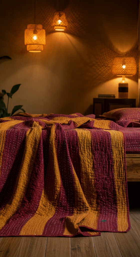 For a traditional home, choose kantha quilts in earthy tones like maroon, mustard, bottle green, indigo, or warm neutrals.