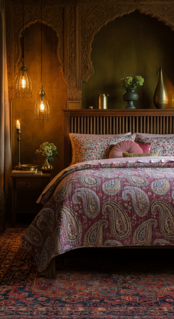 Traditional Indian prints like paisley, block print florals, mughal motifs, or intricate vines work beautifully in a bedroom that leans toward a cultural heritage vibe.