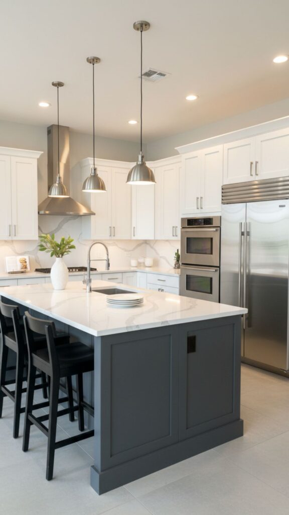 For those who find all-white too sterile, the tuxedo kitchen offers high contrast. It pairs dark cabinets with light countertops, or vice-versa, for a sophisticated look.