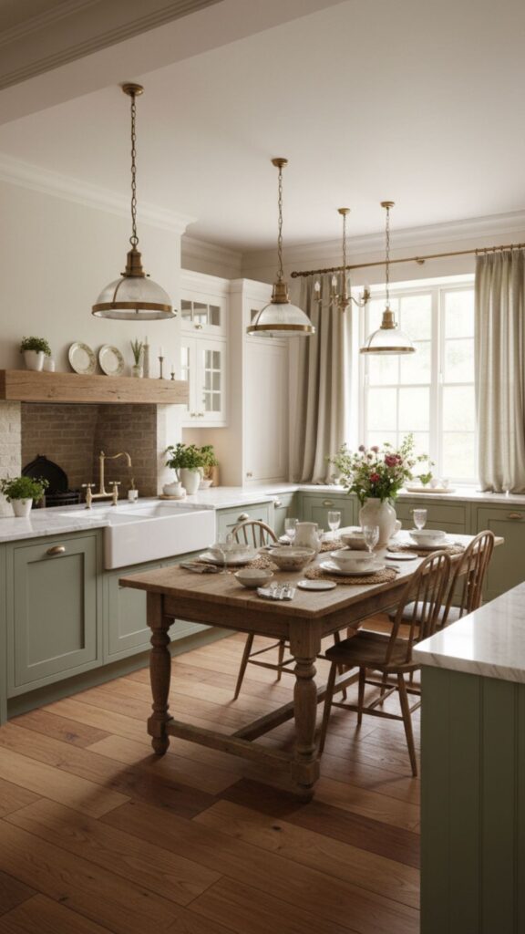 - Use natural stone countertops and antique-style lighting.