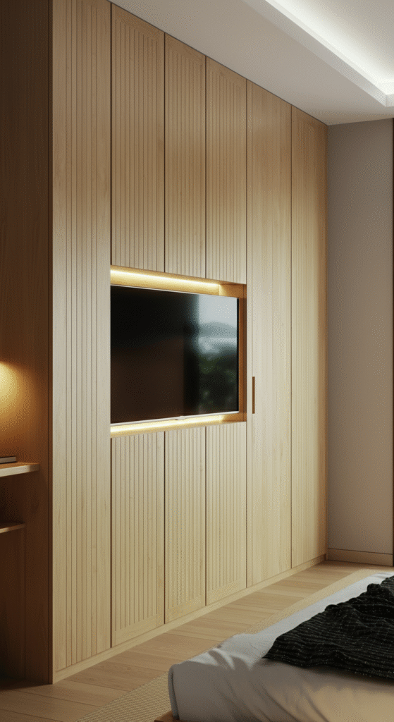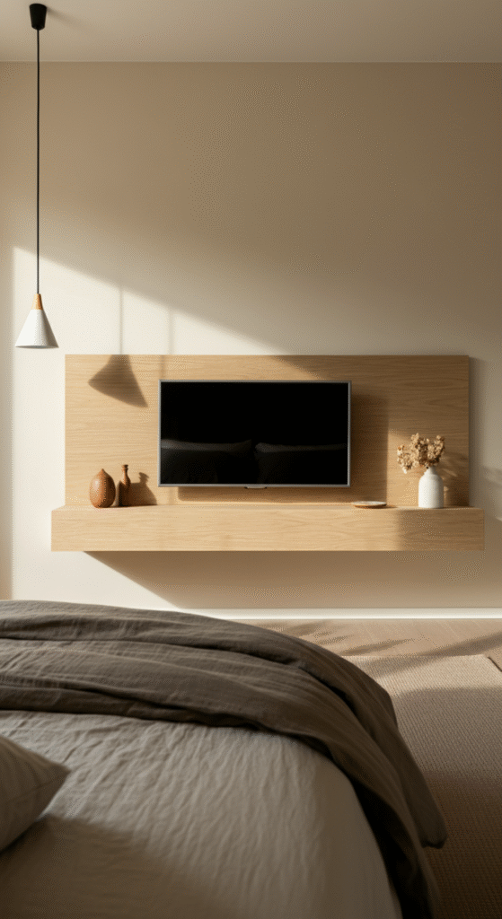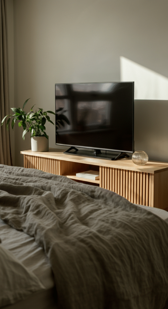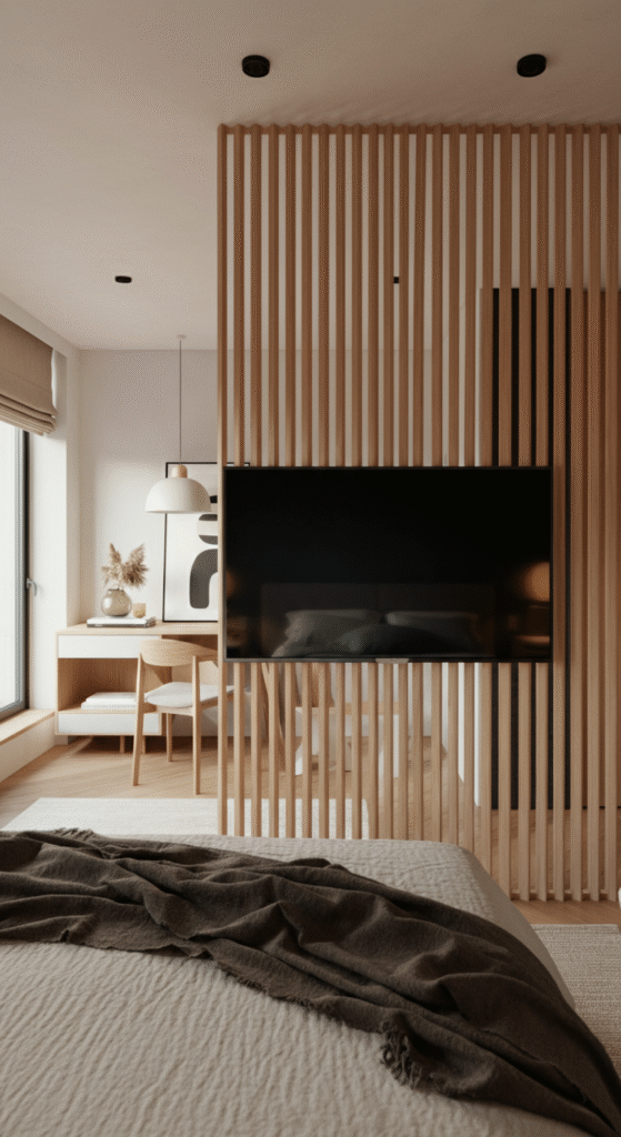 If your bedroom shares space with a study corner, closet, or small seating area, a Japandi TV divider unit is a clever solution. It zones the room without enclosing it. The divider can have slatted wood, open shelving, or a minimalist frame.