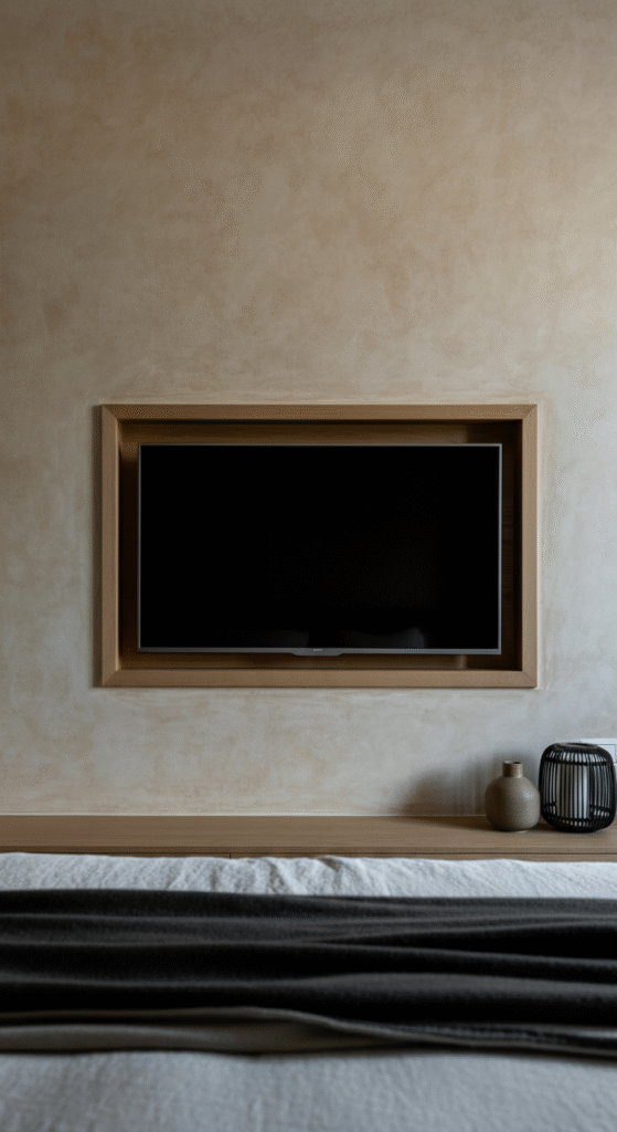 If you want something more architectural, a built in niche TV unit might work. This design blends the TV directly into the wall. No bulky furniture. No visual noise. Just a soft recessed frame around the screen.