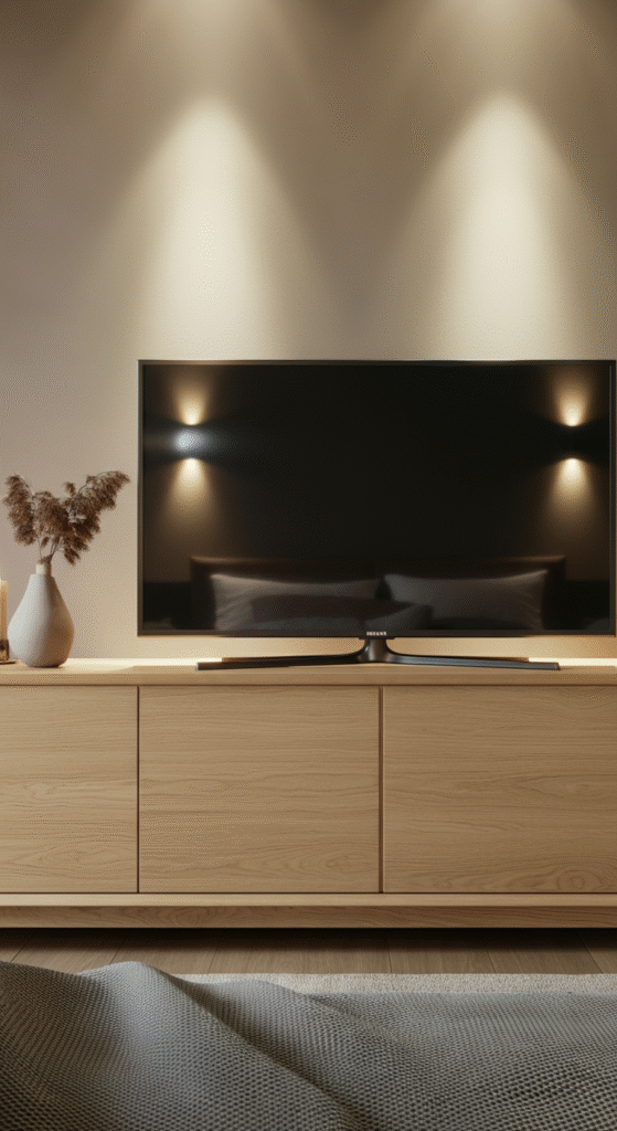 Japandi design loves hidden storage. It keeps the room clean while still being practical. A light wood TV stand with soft close drawers works great for storing remotes, cables, books, extra decor, or even bedroom tech.