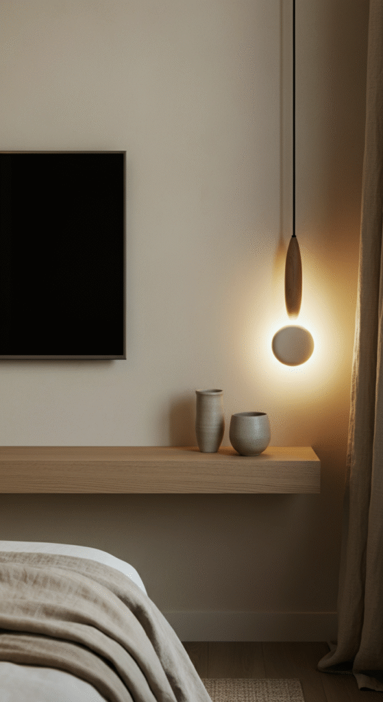 A floating TV unit is one of the most classic Japandi choices. It removes visual clutter, makes the room feel airy, and adapts to nearly any bedroom size. The magic lies in the soft, natural wood grains. They create a grounding effect without overwhelming the walls.