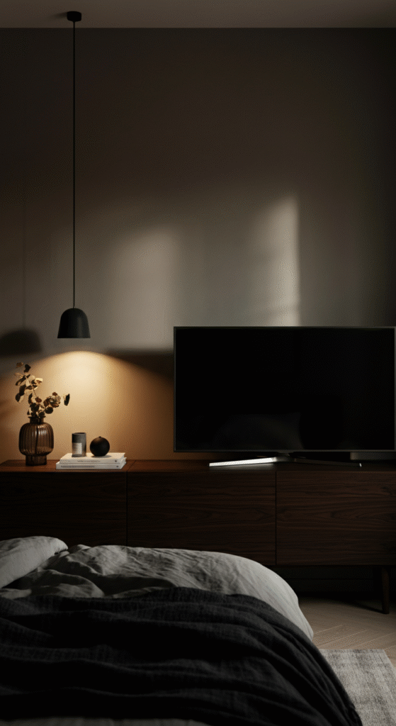 This design works well for bedrooms where you want a cozy, moody vibe. It also helps the TV blend better, since dark wood reduces the harsh contrast of a black screen.