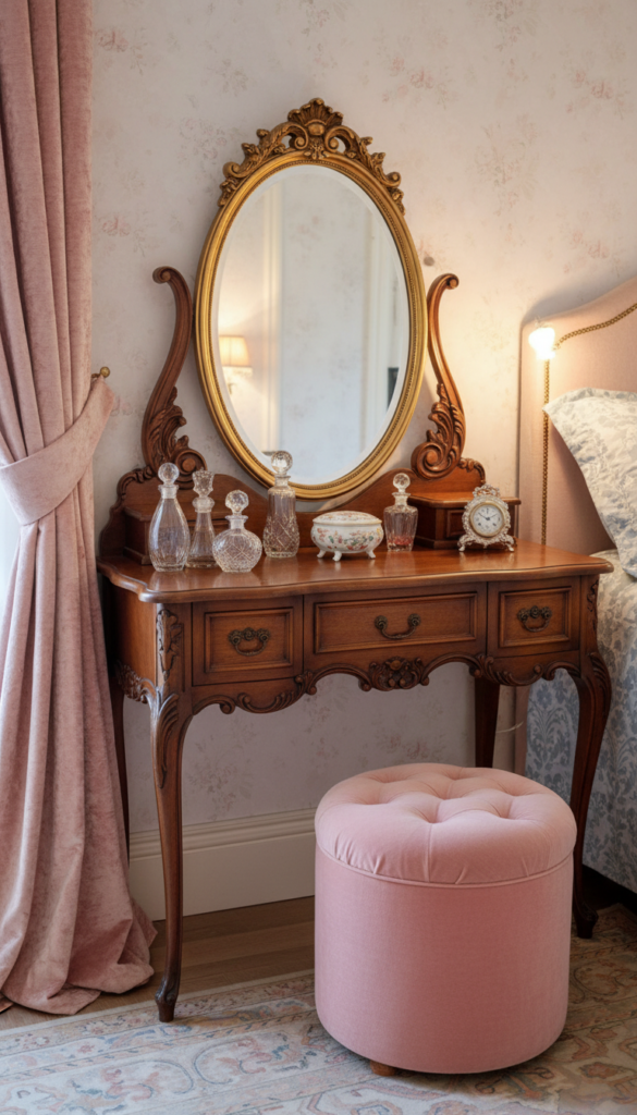- Seating: A tufted stool or a small velvet chair makes the space inviting.