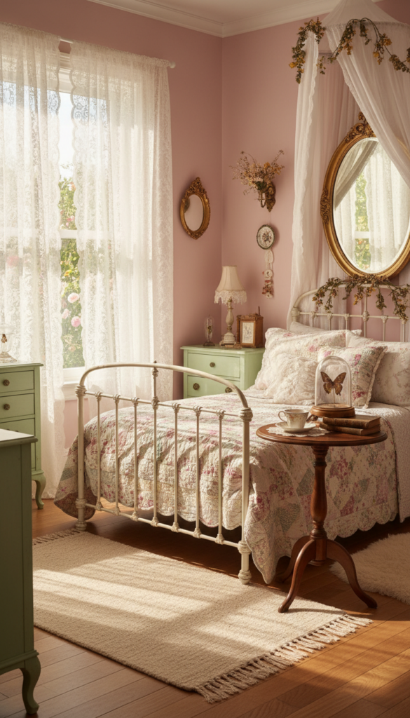 The bed is the anchor of the room. A wrought iron or brass bed frame immediately transports the aesthetic back in time. Look for frames with curved lines, ornate scrollwork, or a distressed white finish. These frames feel visually lighter than solid wood headboards, maintaining the airy pastel vibe.