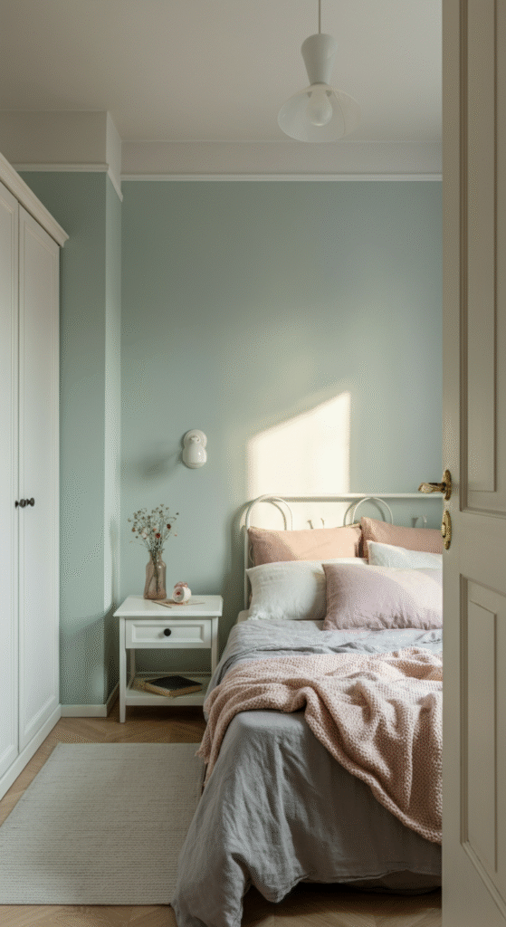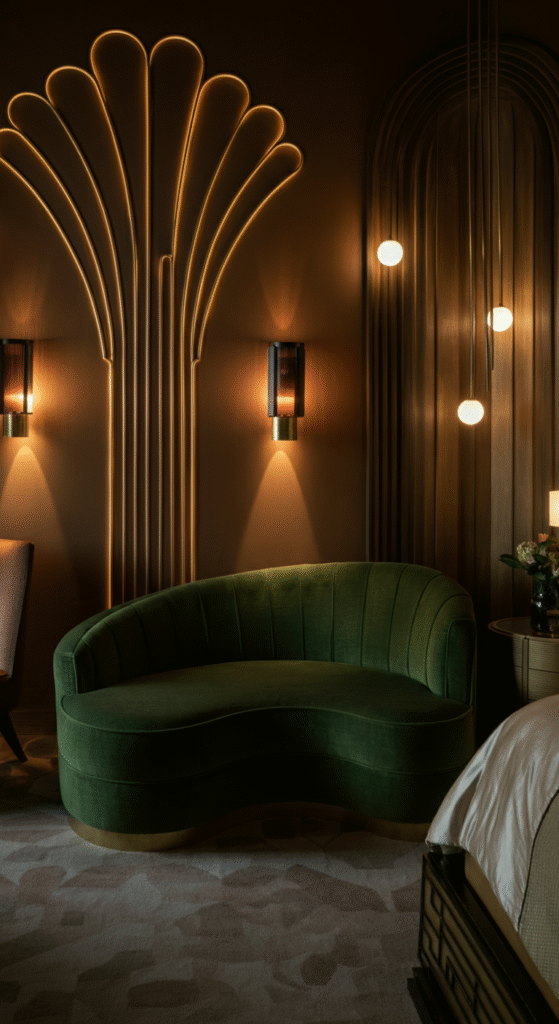 A curved velvet sofa in jewel tones like emerald, sapphire, or ruby turns a bedroom into a luxurious retreat. Or, for a softer mood, blush pink, champagne, or moss green offers a dreamy vintage feel without overpowering the space.