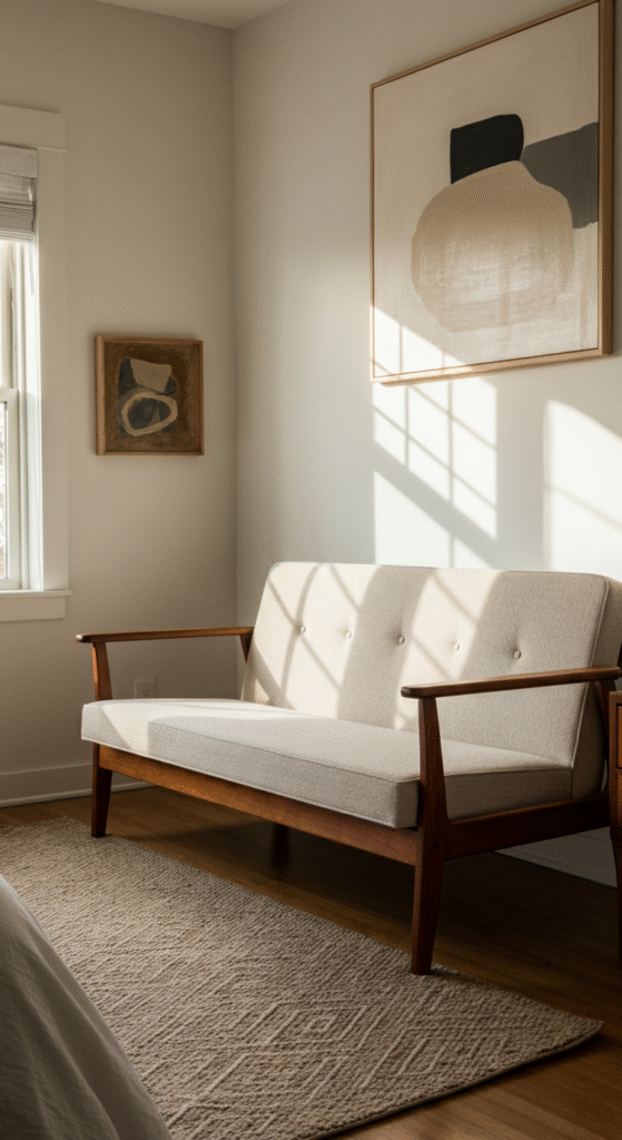 In a bedroom, this sofa style offers a calm and uncluttered look. Pair it with neutral bedding, a textured rug, and framed vintage posters for a soft retro feel. If you choose a muted tone like beige or olive, the look becomes subtle and relaxing. But if you go with mustard, teal, or burnt orange, the room gains a sharp nostalgic punch.
