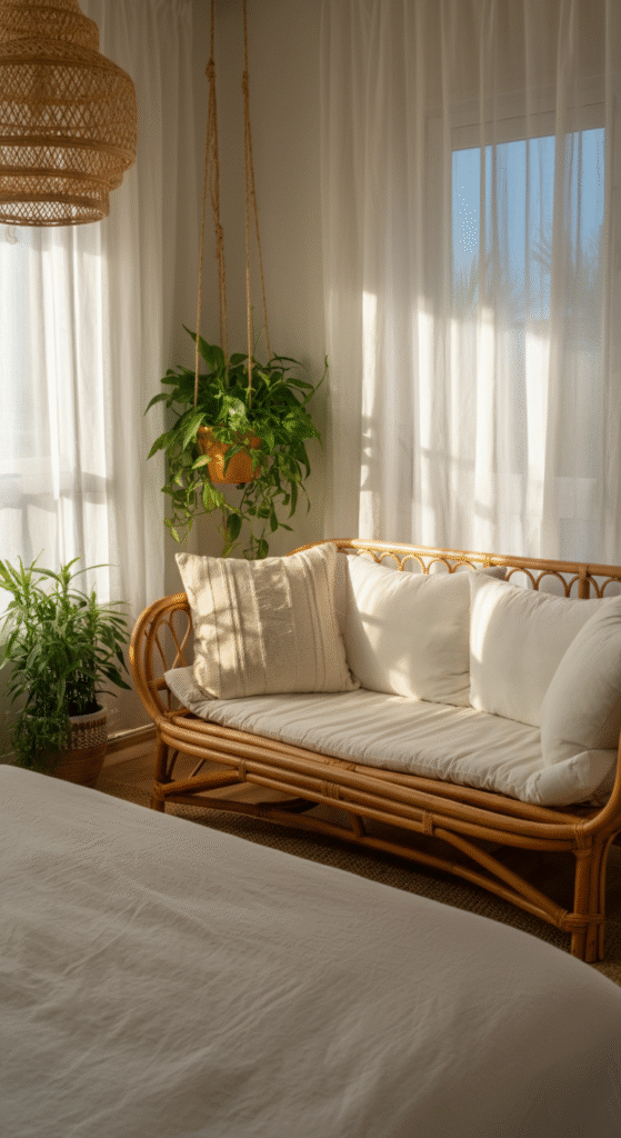 This is for people who want a bright, airy, almost breezy vintage mood in their bedroom. A rattan settee brings natural texture, lightness, and a coastal or bohemian feel without overpowering the room.