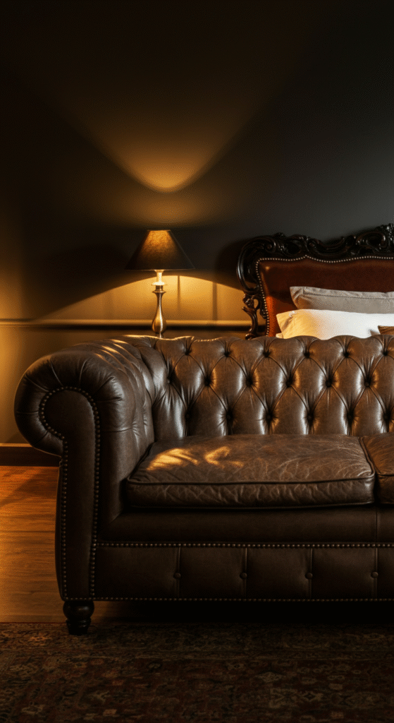 In a bedroom, a leather Chesterfield adds sophistication, warmth, and a grounded vintage feel. A fabric Chesterfield, on the other hand, looks softer and blends with cozy interiors.