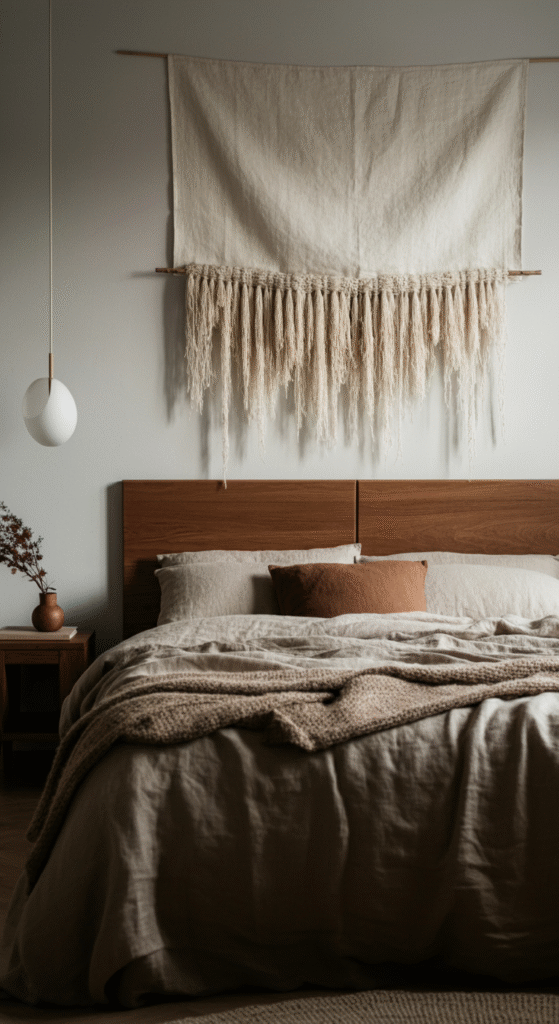 Fabric wall décor is becoming a huge trend in warm minimal spaces. Japandi bedrooms benefit from soft materials like cotton, linen, wool blends, or woven tapestries because they bring comfort to hard surfaces.