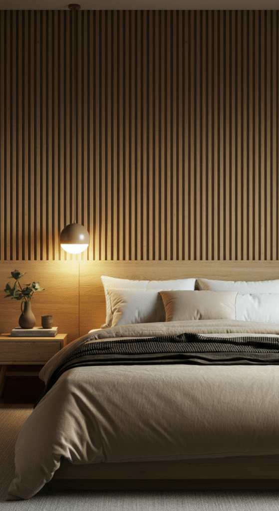 These slats are usually vertical and placed behind the bed or on a side wall. They bring a sense of height and balance to the bedroom. Natural wood tones like oak, ash, or walnut work best.