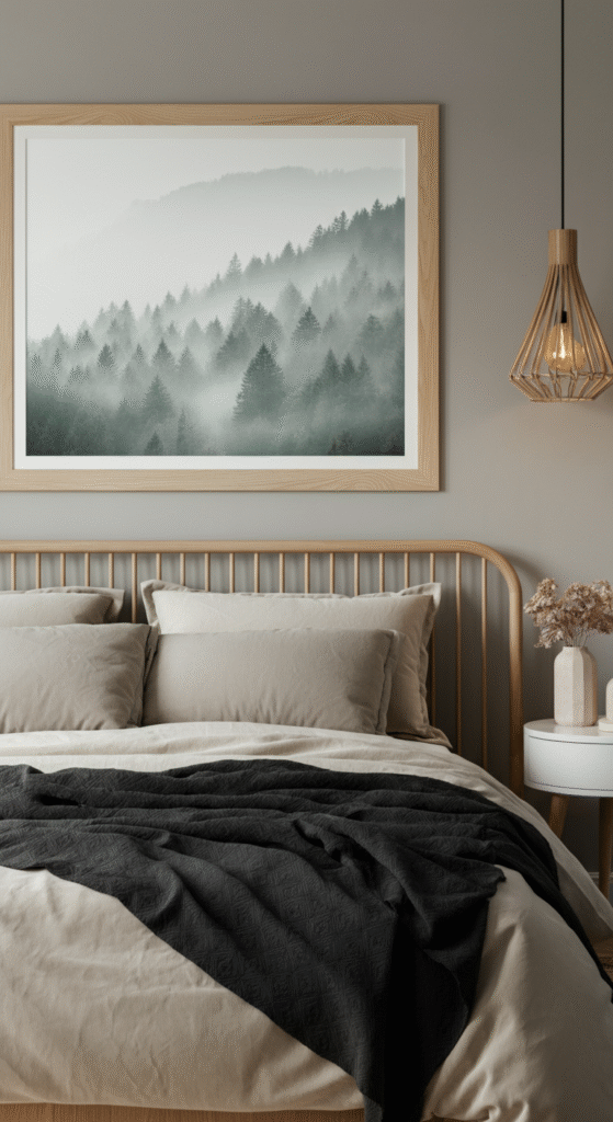 Choose simple matte frames in black, oak, or natural wood. Oversized prints above the bed instantly create a Japandi statement wall.