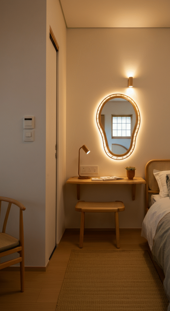 Mirrors are essential in Japandi design because they enhance natural light and open up the bedroom. Instead of sharp geometric shapes, choose organic or slightly curved forms.