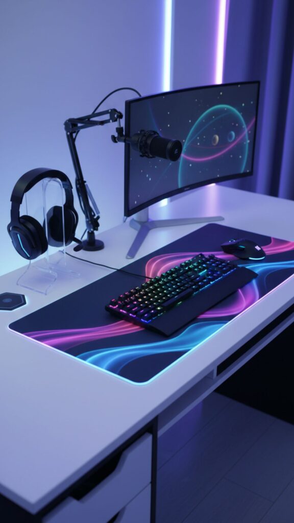 It depends on your vibe, but popular palettes include “Cyberpunk” (Purple, Blue, Pink), “Cozy Gamer” (Cream, Sage Green, Blush Pink), or “Dark Academia” (Warm Yellow, Brown, Forest Green). The key is consistency in your lighting and accessories.