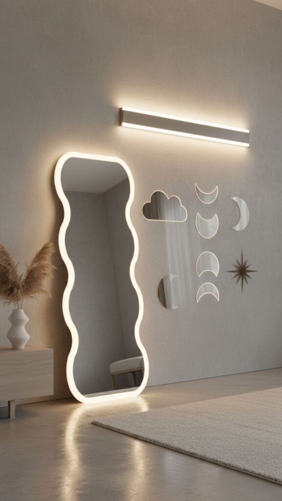 Mirrors aren’t just for checking your outfit; they reflect your LED lights and make small rooms feel larger. In the Zepto aesthetic, unique shapes like wavy or irregular mirrors are preferred over standard rectangles.