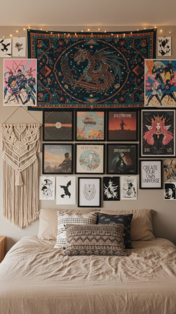 Finally, cover those blank spaces with graphic art. This could be anything from anime posters to minimalist line art or even tapestry. The goal is to create a visual backdrop that tells a story about your interests.