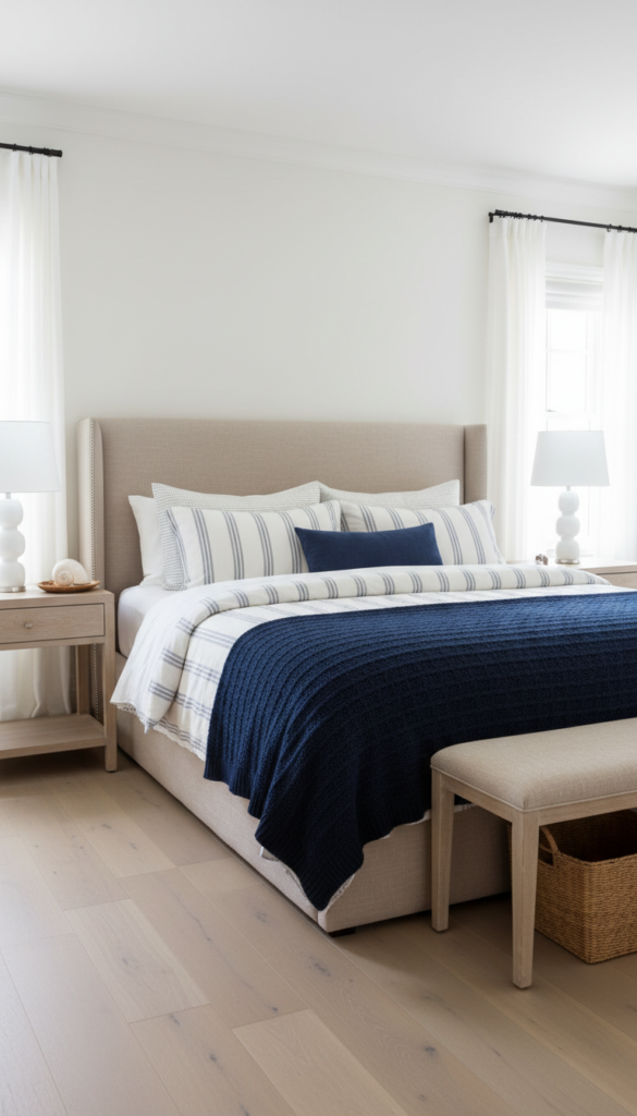 Many people avoid coastal bedrooms because they fear nautical clichés. Anchors, ropes, and obvious maritime symbols can quickly turn a bedroom into a themed space rather than a restful one. A soft nautical influence, however, focuses on color rhythm and texture instead of literal symbols.