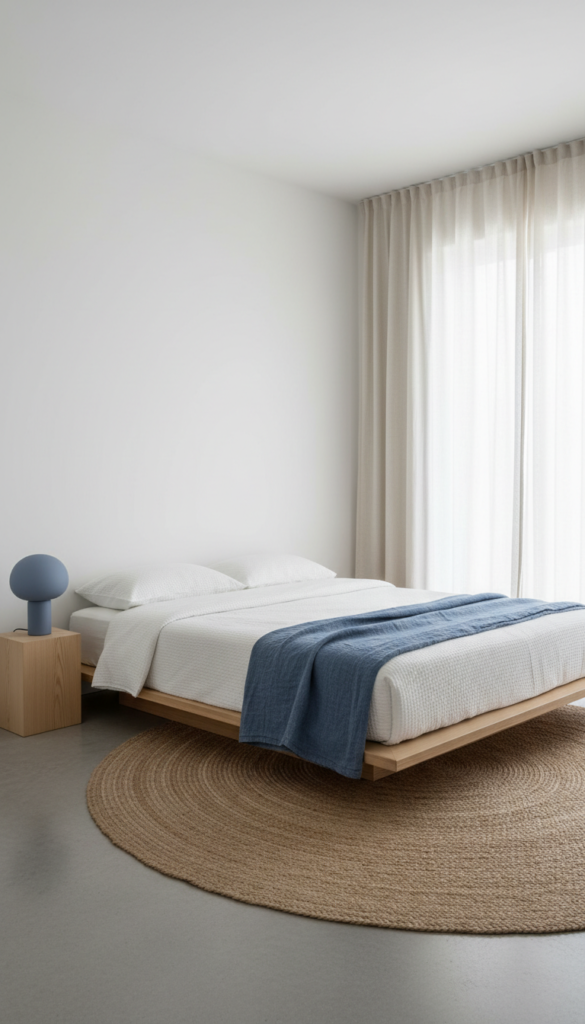 White walls and bedding form a clean base. Blue is introduced sparingly through one or two focal elements, such as a textured throw, a ceramic lamp base, or a single piece of abstract art. The textures do the heavy lifting. Raw linen, brushed cotton, matte ceramics, and lightly grained wood bring depth without clutter.
