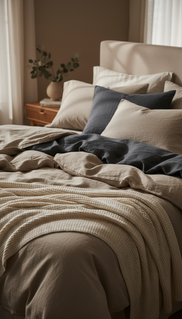 Luxury is often defined by how a room feels, not just how it looks. High-quality linen bedding in shades of oatmeal, charcoal, or rust adds immediate softness. Don’t stop at just a duvet; layer the bed with a waffle-knit throw blanket and oversized pillows. Mixing similar shades creates a monochromatic look that screams “hotel chic” without trying too hard.